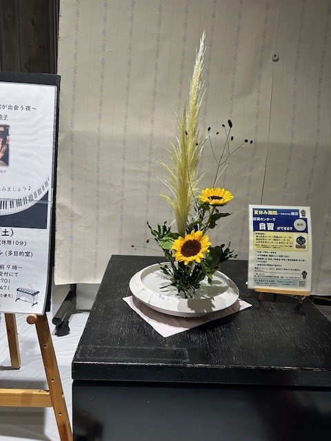 上北沢区民センターの入口にいけました。花材はパンパスグラスの白い穂を背景に、向日葵を高く低いと変化をつけ、吾亦紅(わらもこう)の粒を飛ばし、あしもとをクロトンの葉でまとめました。スッキリ爽やかな夏ですね!