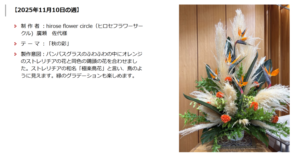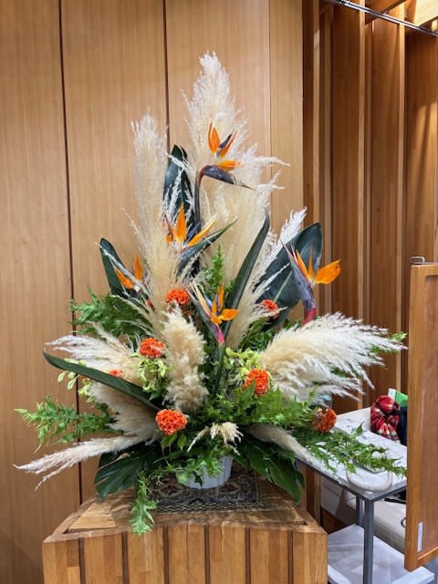 正面玄関なので、華やかに、季節のパンパスグラスや鶏頭のオレンジ色とストレリチアのアレンジ色が素敵です。