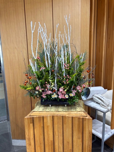 花材は、ブルーアイスと孔雀ヒバで森を晒し三又で冬を表現、ヒペリカムのピンクとデンファレのピンクが可愛い。