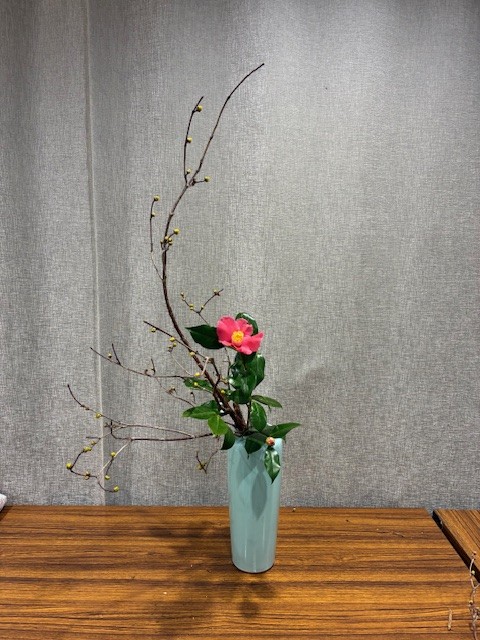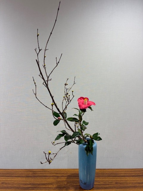 椿は開花一輪と蕾一輪で構成され省略の美を感じるようにいけるーむずい。
